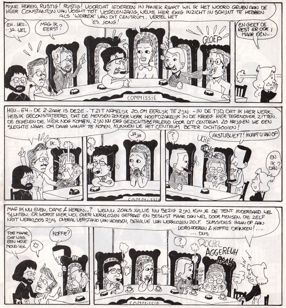 By the end of the 1980s, De Vries was part of the upcoming small-press comic scene, using the pen name "Henkus". He created three full-length comic books starring the unemployed 'Teun', a recent graduate who doesn't know what to do with his life. The books had socially conscious themes related to welfare work and job opportunities. The first publication, 'Teun op Safari' (1979), was made in collaboration with Hans van der Velde for the "activity and advice center" De Halte. It created awareness among youngsters about the problems they might encounter on the job market after leaving school. The follow-up 'Hondsdagen' (1979) was a solo effort by Henkus, and focused on children's holiday work. Written and drawn in collaboration with Rennie de Jong (AKA Renée), the third book 'S.O.S. in de Himalaya' (1981) spoofed the meeting culture and bureaucracy of committees and welfare organizations. 'Teun' reappeared on 28 August 1985 in a promotional supplement to the local newspaper De Koerier, in a full page comic story about Heerenveen's Posthuis Theater.
