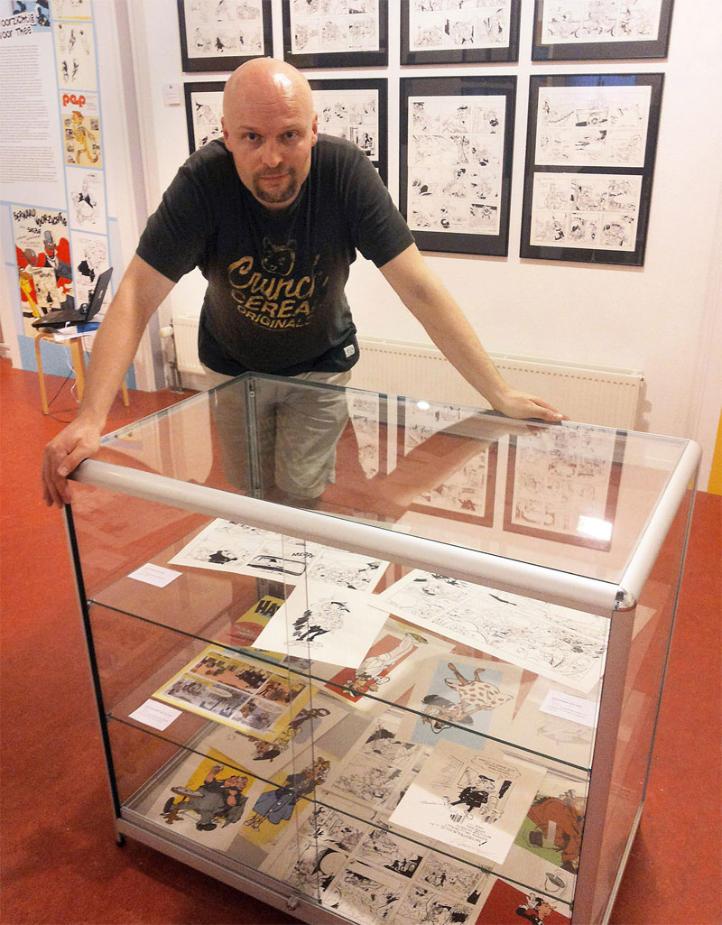 In 1999, De Vries begin combining his cartooning work with a part time day job in a local bookstore. Between September 2004 and December 2018, he found employment with the Dutch Comic Museum in Groningen, where his fascination for comic history was fuelled. He produced several temporary expositions, including ones about comic creator Daan Jippes, the Donald Duck weekly and the girls' magazine Tina, and also took care of the related catalogs and museum books. Since 2019, De Vries has been working as a programmer with Storyworld at the Forum in Groningen, a museum about the art of storytelling through animation, comics and video games.