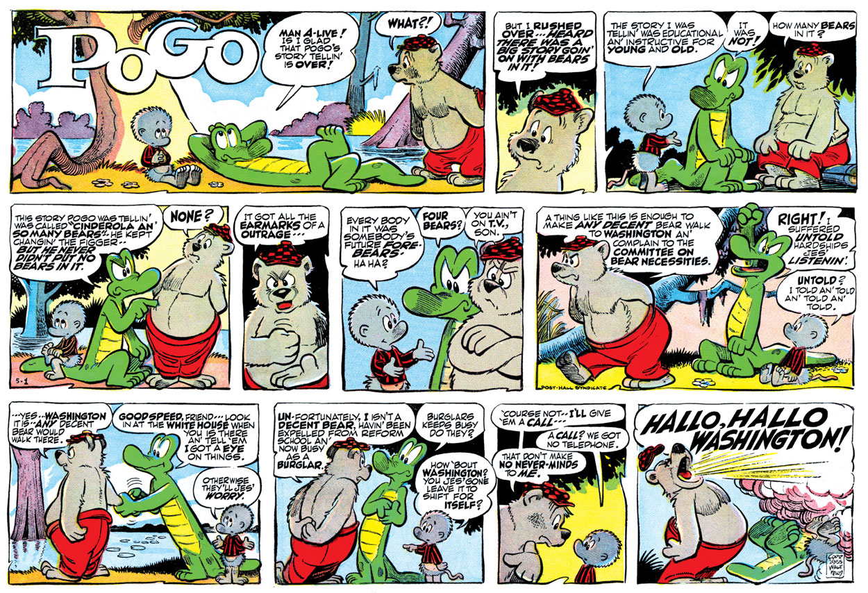 'Pogo' Sunday of 15 May 1955 featuring Barnstable the bear, presumably with prominent input from George Ward.