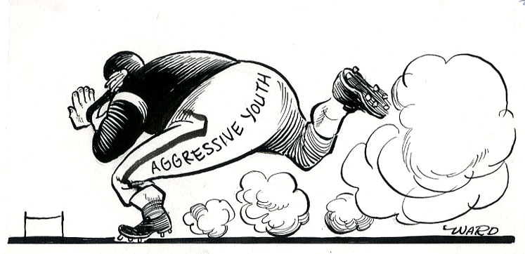 George Arthur Ward was born in 1921 in Scranton, Pennsylvania. He and his family were living in Philadelphia, when in 1940 Ward joined the Marines, serving overseas from 1942 to 1944. During his service, he was also active as a cartoonist. While stationed in Australia in 1943, he presented a bound book of his cartoons to the President's wife Eleanor Roosevelt, who was visiting his camp. Back in civilian life, Ward attended the Hussian School of Art in Philadelphia, Pennsylvania, where one of his fellow students was the future comic book artist Joe Maneely. Among his main influences during his career have been Roy Crane, Walt Kelly and John Liney.