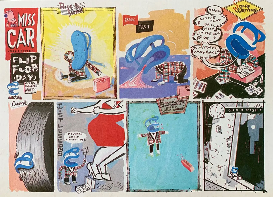Wayne White is an American multi-disciplinary artist, working as a painter, sculptor, illustrator, animator, set designer and comic artist. As a cartoonist, he worked for several magazines in the 1980s, with 'Miss Car' (1984-1985) being his regular feature in the East Village Eye and High Times magazine. He is possibly best-known as a set and puppet designer for the 1986-1990 TV show 'Pee-Wee's Playhouse'.