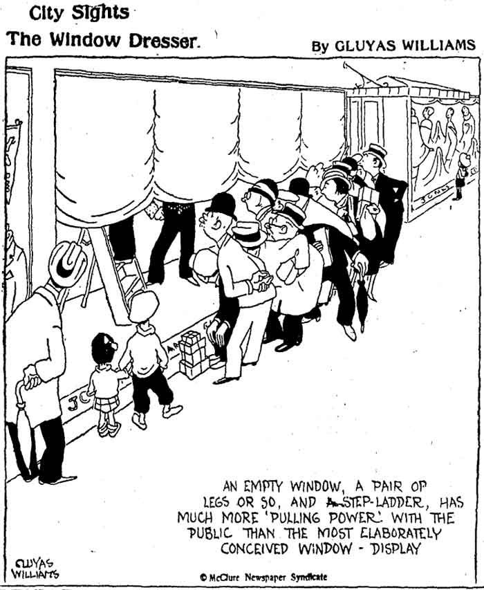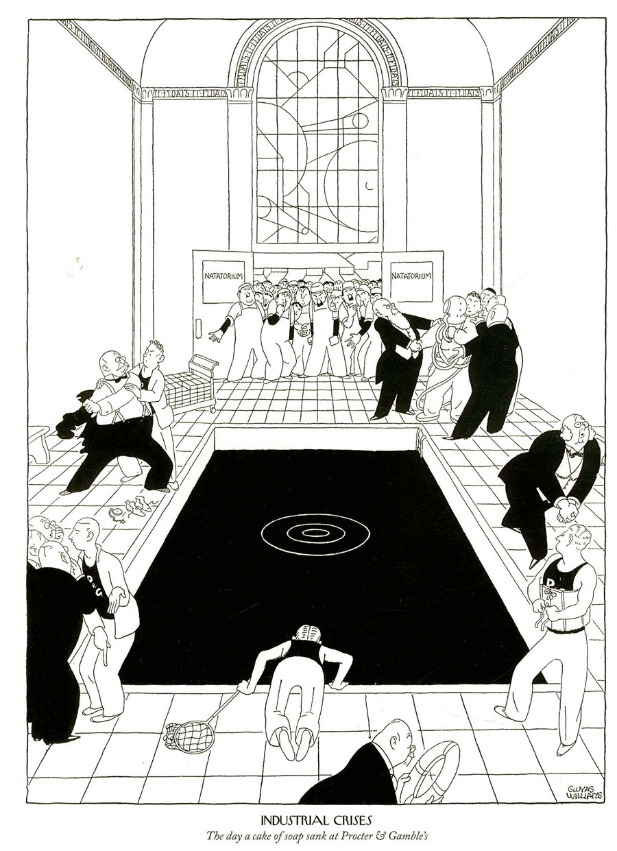 Some of Williams' observational one-panel cartoons are set in specific locations. 'Suburban Heights' (published in The Boston Globe starting on 19 September 1922) focuses on people in towns and villages, while the urban variant is titled 'City Sights'. The comedy varies from curious passersby stopping to stare at a half-opened shop window, to a more poetic scene of a lonely policeman patrolling the streets at night. In The New Yorker, 'Industrial Crises' brings the reader to the highest echelons of society, featuring Williams at his most absurd, with stuffy businessmen in suits panicking over extraordinary trivial matters. A classic example is his cartoon depicting employees of Heinz 57 steak sauce frantically recounting their stock, because they have produced 58 varieties instead of the usual 57. 'Industrial Crises' is also a rare showcase for Williams' caricaturing. In some cartoons, the crisis is set in the White House, where president Herbert Hoover refuses to leave until his other rubber shoe is found, or in the Oval Office, where president Franklin D. Roosevelt is cornered by dozens of curious journalists. 'Bedtime Stories', (published in The Boston Globe from 24 October 1922 on) is set in people's bedrooms.