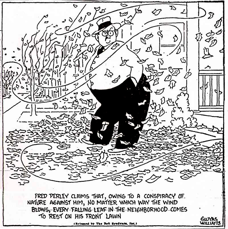 Williams drew his first daily comic strip for the Boston Journal right before the First World War broke out. Titleless, it ran for three months during the summer period and looking back on it, the artist described it as "terrible". Between 1910 and 1920, Williams worked as head of The Youth Companion's art department. During this period, he started freelancing cartoons to other magazines, like Century, Collier's and Life. In the latter magazine, he drew the political satire 'Senator Sounder'. For the Boston Evening Transcript, he made theatrical caricatures and, briefly, political caricatures for the William Randolph Hearst papers. Many of Williams' cartoons from the 1917-1918 period ridiculed the German emperor Wilhelm II and general Paul Von Hindenburg. Originally, his cartoons were syndicated by Wheeler, but from 1924 on, the Bell Syndicate carried them for the rest of his career. Throughout the 1920s until the early 1950s, Williams was also house cartoonist for the newspapers The Boston Globe and The Plain Dealer.