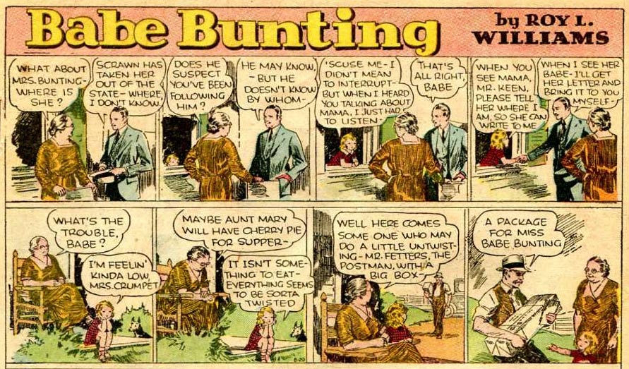 Some sources credit the artist as the Roy Williams (1907-1976) who worked as an animator and gag writer for The Walt Disney Company from 1930 through the 1960s, known as "The Big Mouseketeer" in the children's TV show 'The Mickey Mouse Club' (1955-1959). A source cited in Allan Holtz' 'American Newspaper Comics' encyclopedia states that Roy L. Williams passed away in October 1938, and episodes of 'Babe Bunting' during its final year-and-a-half were made by Kemp Starrett.