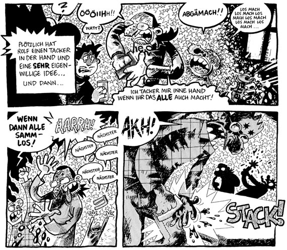 Wittek also ventured into self-publishing through Edition Rostfrass in the 1990s and created photocopied comic books like 'Comiczeichner sind…', 'Heutelein', 'Schmocka', 'Hunde', 'Chwouhl' and 'Boiler'. His 'Boiler' comics were created in 1997 with Loppe and set in a world of scrap metal, tools and machinery. He got a job with the Ully-Arndt-Studios as advertising artist and assistant animator in 1998. He also ghosted for Ully Arndt on the weeky 'Mecki' comic for the TV magazine Hörzu in 2000 and 2001.