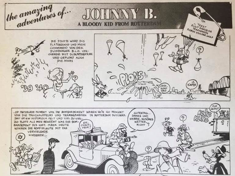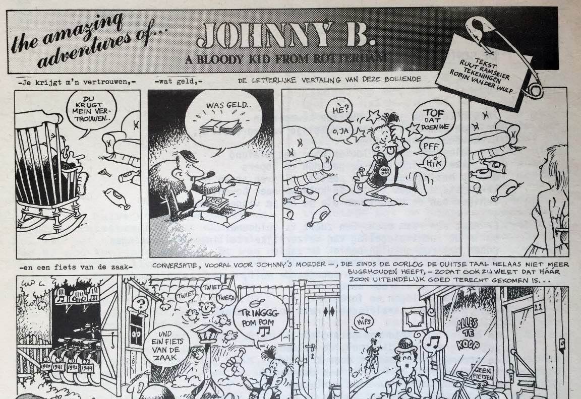 In the late 1970s, the Eksit Krant ran the comic strip 'Johnny B. - A Bloody Kid from Rotterdam'. Written by editor Ramseier and drawn by Robin van der Wulp, the comic was a satirical take on Rotterdam's past and present, covering the city's cultural hotspots as well as its ordeal during World War II, when it was heavily bombed. Another contributor to the Eksitkrant was the comic artist Robert van der Kroft, who, for instance, designed the October 1980 issue.