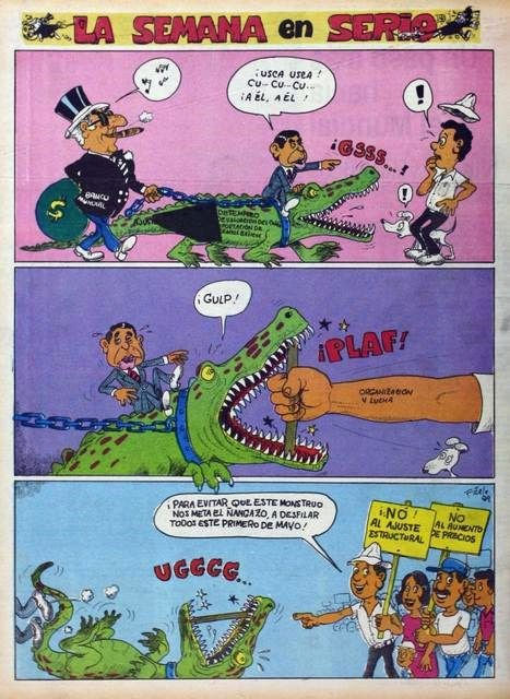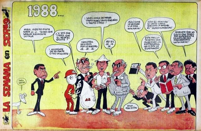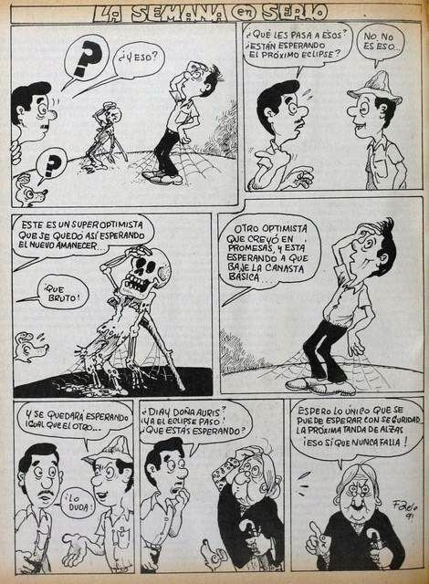 Zele eventually joined the now-defunct communist party weekly Adelante, for which he created the regular feature called 'La Semana en Serio' (1974-1991) during a period of seventeen years. The page's set-up was similar to that by his colleague Hugo Díaz in the weekly Pueblo, although its humor was more biting and sarcastic in tone. Zele provided his view on the political and social situation in Costa Rica and abroad, and was at his sharpest during the years of US President Ronald Reagan in the 1980s. The US State Department forced Costa Rica's involvement in the so-called "Dirty War" against the Sandinista National Liberation Front, a revolutionary movement backed by the communists which had overthrown the Nicaraguan president Anastasio Somoza DeBayle in July 1979. The US feared that Nicaragua would become a second Cuba, and secretly supported the Contras, who operated from the neighboring countries Costa Rica and Honduras. Zele's sharp pen commented heavily on all the turmoil, understandably from a communist point-of-view.