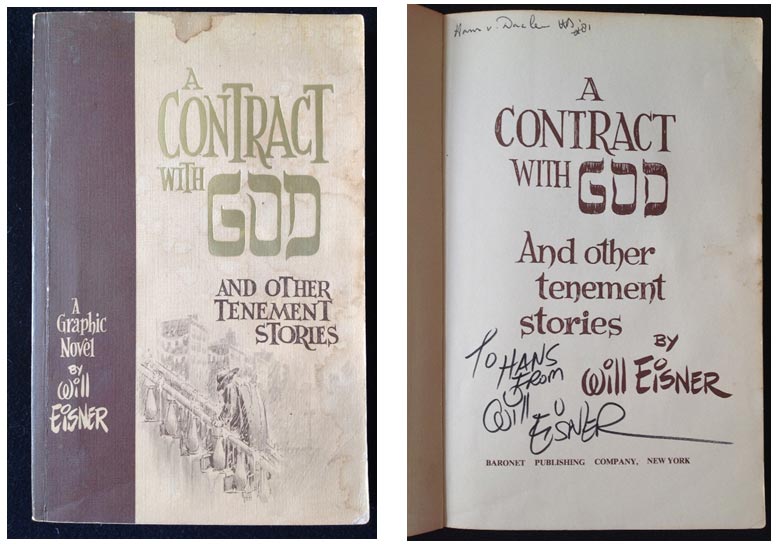 Ditmaal gebeurde deze hernieuwde kennismaking met het stripparadijs met losse handjes. Ik was meteen verkocht. Ik reageerde bedeesd op die overvloed aan schoonheid. De plattegrond van de winkel zie ik nog steeds voor me in m'n dromen. Na een aantal jaren kwam er zelfs een mooie ruimte voor de stripgalerie bij. Tentoonstellingen werden gekoppeld aan signeersessies. Voor mij is de meest gedenkwaardige die met Will Eisner, van onder andere de strip 'The Spirit'. Deze grootmeester was een nieuw pad ingeslagen met een graphic novel: een viertal tenement stories onder de titel 'A Contract with God'. Kees had als onderdeel van de festiviteiten rond het vijftienjarige bestaan van de winkel een Jiddische en een Hebreeuwse vertaling laten maken. Eisner was zeer onder de indruk van deze geste en Kees zeer dankbaar. Dit alles werd beklonken met een mooie kooptentoonstelling en een bezoek van Eisner aan de Kerkstraat. Ik liet hem een mooie hardcover met de titel 'De vrouwen van de Spirit' signeren, maar had nog een boek bij me. Hij zag me schutteren en ik presenteerde hem een eerstedrukexemplaar van "A Contract with God' uit 1978. De paperback was helemaal sjofel gelezen en zelfs slachtoffer geworden van een lekkage. Hij nam het beduimelde boek in ontvangst, bladerde er in en zei: "But this is your copy! It's obvious for me that you love this book. It will be an honour for me to sign it." En dat deed-ie vervolgens.