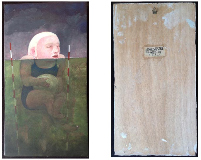 Maar de mooiste aanschaf bij Lambiek vond ik als een parelduiker in de modder. In de voorzomer van 1991 zie ik op het verhoogde galeriegedeelte een langwerpig plankje op de stoffige vloer liggen. Ik herken, door de versluiering heen, zonder het ooit gezien te hebben, een schilderwerkje van de Utrechtse schilder Peter van Poppel. Ik raap het houten paneeltje op en kan me weerhouden reflexmatig de laag stof er af te vegen: we moeten pragmatisch blijven! Voorzichtig draai ik het paneeltje een slag om en zie het opgeplakte papiertje mijn voorgevoel bevestigen: 'Peter van Poppel, Sportzwemster 1972 VTR'. Het olieverfje laat een in badpak gestoken mensfiguur in foetushouding zien in een omgeving die het meest doet denken aan een donkere Hollandse sloot. De figuur is ingekaderd door twee rood-witte stokken in het water en een donkere onweerslucht. Ik loop met deze vondst naar Kees en vraag hem of het paneeltje te koop is? Pas op dat moment veeg ik het laagje stof naar de vloer met de woorden: "Ja, het lag daar ergens in die hoek, op de grond. En ik zie nu pas dat er een jongedame al twee keer met haar naaldhak op heeft gestaan. Oei!" Kees: "Ja, mooi hè! Dat is van Peter van Poppel. Die schilder ken ik goed. Het heeft jaren bij mij aan de muur gehangen… Ik zat te denken aan fl 1000,-." Ik: "Maar dan leg je 't toch niet zo op de grond?!" Kees: "Ja, we hebben het een beetje druk gehad met het inrichten van de tentoonstelling. Ben je geïnteresseerd? Ik wil het wel voor je reserveren!" Gezien het voorzomer was had ik genoeg vakantiegeld op zak om van een kort moment van rijkdom te mogen spreken. Duizend gulden was veel, maar het vakantiegeld dekte die toekomstige kosten meer dan. Ik heb diezelfde dag nog Galerie Jas in Utrecht en Galerie Petit in Amsterdam gebeld, en op mijn vraag naar wat ik zo'n beetje zocht van Peter van Poppel en daarvoor bij hen kwijt zou zijn, hoorde ik bedragen van rond de vijfduizend gulden. Aan een paneeltje konden ze me echter niet helpen. Peter werkte al jaren enkel nog maar op doek, en heel soms op karton. Thuis had ik een mooi klein overzicht van zijn werk, onder de titel 'Groot atelier' (Querido, 1982), en daar vond ik op bladzijde 28 een sportzwemster uit dezelfde periode. Het jaar van ontstaan, 1972, geeft aan dat de inspiratie voortkwam uit de Olympische Spelen die toen in München werden gehouden. Een schilderijtje dat een sportzwemster in een meer natuurlijke omgeving toonde: een zwembad. In 1983 had ik een kooptentoonstelling met werk van Peter van Poppel bezocht in het Singer Museum te Laren, maar kon alleen toekijken en bewonderen. Alle werken aan de muur was onbereikbaar geprijsd. De dag daarop ging ik naar de winkel en vertelde Kees dat ik met mijn vakantiegeld het paneeltje ging aanschaffen en dit jaar maar niet naar Portugal zou gaan, maar naar de Kortenhoefse Plassen en de Kennemerduinen. Ook hij begon te glunderen: "Ja, mooi hè, jongen. Nu gaat het bij jou aan de muur."