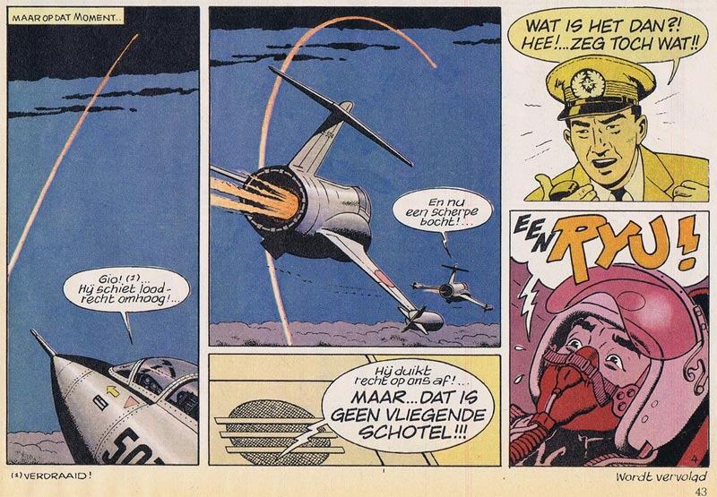 Anderhalf jaar later verhuist dat joch van een stadje in het Gooi naar een dorp in het Gooi, wat geen fijne ervaring is, maar 'm wel een excuusabonnement op het stripblad Pep oplevert, "wat een stripblad, por dios!" De levering van Pep kwam hortend en stotend op gang. Het allereerst ontvangen nummer bevatte het begin van het laatste door E.P. Jacobs voltooide Blake en Mortimer verhaal 'De 3 formules van professor Sato', vier pagina's afgesloten met een echte cliffhanger. Vervolgens miste ik de twee daarop volgende nummers, zodat ik pas jaren later, bij het doorbladeren van het stripalbum, te zien kreeg wat nou die verbijsterende Ryu was? Lambiek verdween al snel weer voor een paar jaar uit beeld. In heel het Gooi was er één stripwinkel: "Wammes" van Jet Fermin in Bussum. Een noodzakelijke uitwijkplek indien je daar in de buurt op de Gooiland-MAVO zit. Het blaadje Snavel met illustraties van een jonge Gerard Leever was de spreekbuis naar de buitenwereld. Jet hield het snel voor gezien en verhuisde elders heen. Haar broer Flip herinnerde me aan het bestaan van dé stripwinkel van Nederland die toch echt in het best wel nabijgelegen Amsterdam lag: Lambiek. Ik hoorde dat de winkel niet meer in het souterrain gevestigd was, maar een veel grotere ruimte had verworven, dichter naar de Leidsestraat toe. Ook het uithangbord was veel prominenter geworden. Een letterlijk opgeblazen prentje uit het album 'Prinses Zagemeel' (1949, pagina 9 onderste strook).