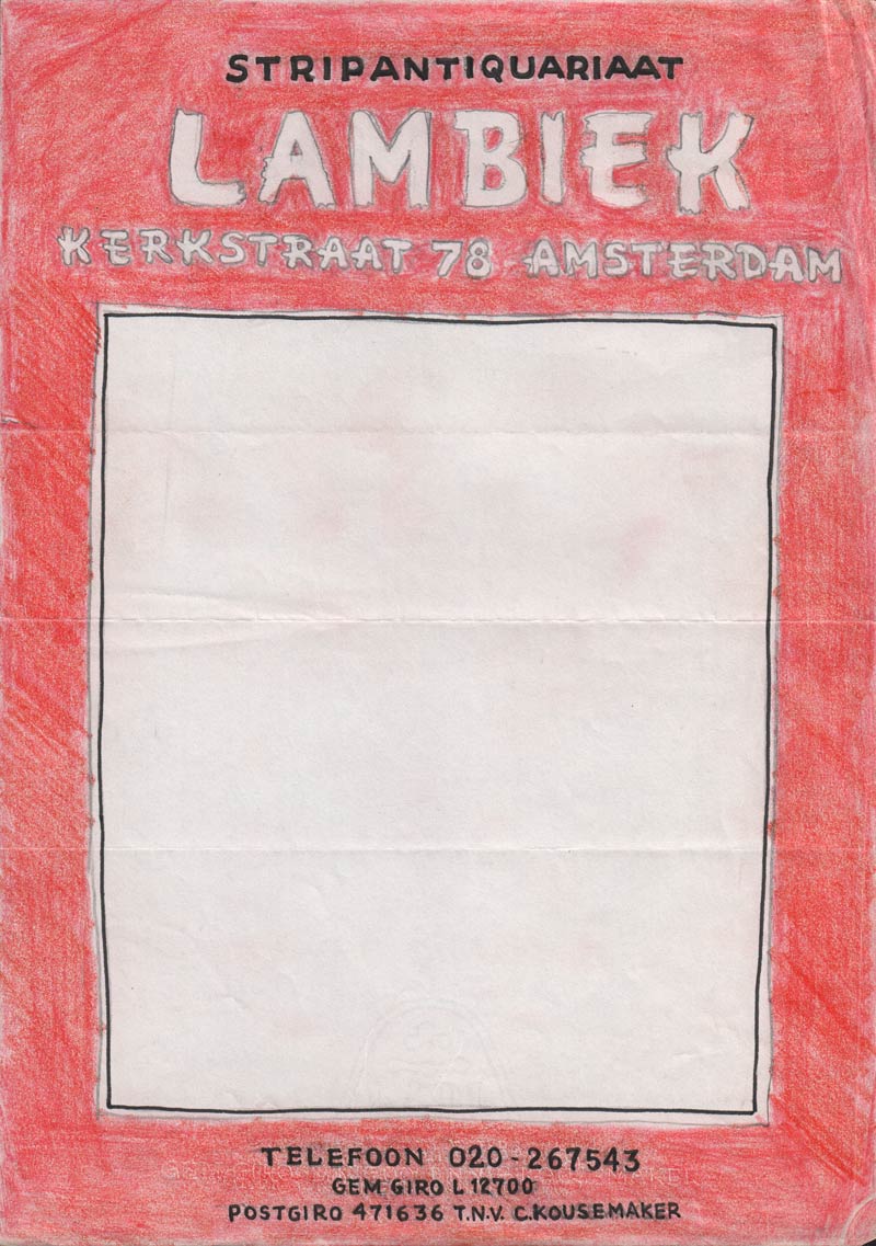 On 29 November 1980, Lambiek moved from number 104 in the Kerkstraat to number 78. The location had previously housed the firm A.S.O., a cleaning service for awnings and shutters. Peter Pontiac made a beautiful drawing of Kees Kousemaker flying away to the new address, which still can be seen on the home page of the Comiclopedia. The new store had two extra floors with rooms upstairs, which Kees rented out to other residents, after he managed to buy the building. This gave him extra income which helped him finance other dream projects. But Kees wasn't a greedy landlord. An elderly lady living above the store only paid 100 guilders (45 euros or 52 dollars) a month for her stay. Kees hosted a "Comics Documentation Center", a room which offered journalists and researchers a chance to delve into Lambiek's collection of reference works and secondary literature.