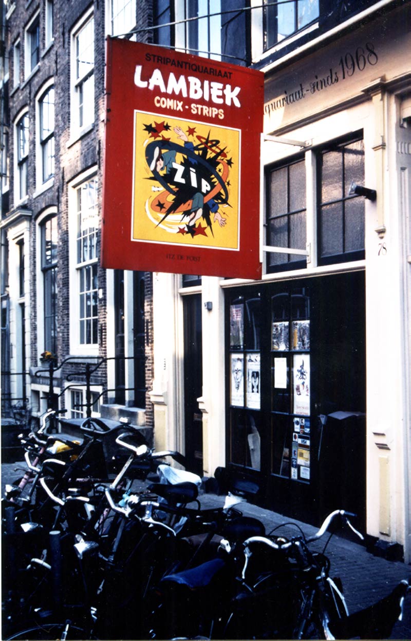 To be sure that newcomers would spot our new address, Herwolt van Doornen felt an official logo would be a perfect idea. In line with the store's name, it was only natural to pick an image from a 'Suske en Wiske' story by Willy Vandersteen, preferably featuring Lambik, the character after whom the store was named. Van Doornen discovered an intriguing prototypical Pop Art-like panel in the story 'Prinses Zagemeel' (1947-1948), where a magic spell ("ZIP!") changes Lambik into a centaur. This abstract image perfectly captured the wonder and excitement of a classic comic book adventure. Job Goedhart designed the logo in the format of a 'Suske and Wiske' comic book. The caption "Itz de foist" ("It's the first") was lifted from George Herriman's 'Krazy Kat'. This specific quote was an idea from underground comix import importer Bill Daley (a man who looked like TV wizard Catweazle, according to Kees) to refer to Lambiek's status as the first European comics store. The logo was then framed inside a sign, painted, lettered and colorized by Onno Docters van Leeuwen, and hung above the store, much like the signs above traditional European pubs. Kees liked the look because it symbolized Lambiek's ancient status and gave his store a classy public image. The original sign remained in use until the next move in 2003. The ZIP logo was also featured prominently on Lambiek's eye-catching plastic bags, which by now have been spotted all over the world, including on the Great Wall of China.