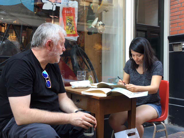 On 7 June 2016, Derf Backderf makes a drawing for our regular customer Paul van Dijken in front of the store.