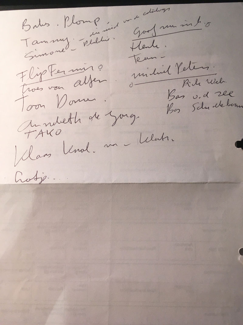 Lambiek's story needed to be told. In an early 2018 correspondence, Kjell Knudde strongly supported Bas' original plan: publish the entire chronicle on the Lambiek.net website. The two Comiclopedia writers decided to work together to create 'The Story of Lambiek'. But where to begin? Although this difficult task had never been attempted before, usable material was ready for Bas to look through: in late 2015, when Lambiek moved from Kerkstraat to Koningsstraat, Bas took all three the boxes of Lambiek's press clippings and photo archive to his Zaandam home. In the summer of 2018, he organized the content of all the boxes and scanned the interesting pieces. Bas then filled a "Lambiek archive" folder in Dropbox with digitized news articles, interviews, press releases, artwork and audio/video files for Kjell to explore. The process of arranging events in chronological order, completing fragmented memories with information from interviews and news reports, and analyzing photographs for their timeframe helped us put events in their historical context. With the newly uncovered information, Kjell and Bas filled Lambiek's 1968-2018 timeline with all the important and noteworthy events they could find. A partial list of former Lambiek employees was created with the help of Klaas and Boris. Although employee names lost in the mist of the early years were transcribed from video footage of Kees' speech from Lambiek's 40th anniversary party, the bad sound quality made it difficult to decipher what Kees was saying. By a stroke of luck, Bas found Kees' original cheat sheet for the speech crumpled up in one of the boxes, helping him to fill in the blanks. Then, in the company of Boris Kousemaker, Bas visited Klaas Knol in his Lelystad home, using his iPhone to record legendary anecdotes of Lambiek's most memorable moments.