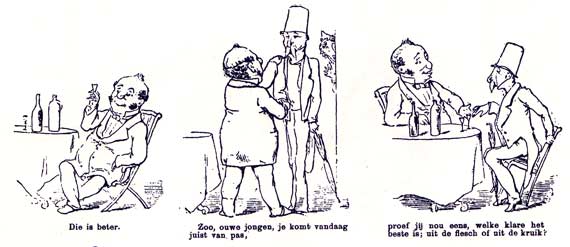 Two gentlemen discuss the quality of different brands of genever liquor. Artwork by Jan Linse