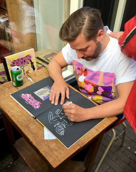Sam Peeters is part of the comics collective Lamelos. Coming from the Kampen art academy he has been working with Aleks Deurloo, his brother Boris and Jeroen Funke on a collective oeuvre since 1997. Their most famous collective creation is 'Kaasheld en Poephoofd', which has appeared in self-published comic books, as well as the magazines Zone 5300 and MYX. Outside of Lamelos, Sam has published work in Vrij Nederland, Jippo and Van Speijk. In 2010 he published his silent solo comic 'In de Schaduw van mijn Lul' with Oog & Blik. His graphic novel 'Fucking Hell' was published in 2016. Peeters is also experimenting with other art forms, such as silkscreens, paintings, film and performing arts. He is on the board of the Dutch Comics Museum in Groningen, and he is a teacher with the Minerva Academy in Groningen (illustration) and Artez Zwolle (comic design).