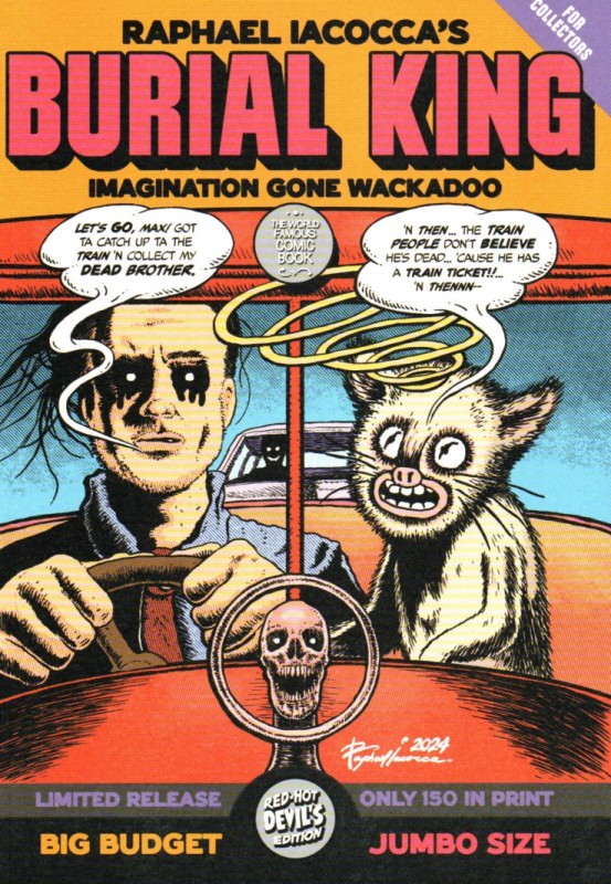 A midday film screening entwines the lives of eccentric theatre attendees in this subversive graphic novel by Raphael Iacocca. Meet Max, the jitterboned kitten who befriends an evil skeleton in the cinema foyer. Meet Kennedy, the cornsilk country girl turned highbrow theatre manager, hiding her molasses-tongue from her colleagues. Meet Warrick, the tragic leading man of our midday movie, chasing down his deceased brother’s stolen corpse. A romping metaphorical horror that crescendos when a beer-drunk film projectionist reveals himself as the puppet master behind it all. Burial King is an experimental graphic novel mixing horror, surreal comedy, and metafiction. Discover Raphael Iacocca’s singular vision in this limited edition comic book, perfect for collectors of underground comics and fans of dark, eccentric stories.