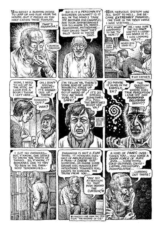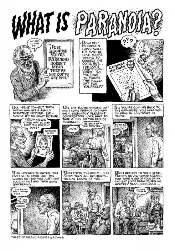 \r\nThe seminal cartoonist who single-handedly invented the alternative comics format of the one-person anthology in 1967 with ZAP returns at age 81, still raging at the world and himself, still drawing like a master, and still funny... mostly. In his latest comics excursion, Crumb dives down internet and newspaper rabbit-holes, and comes up asking questions. Why don\'t we know the real background of deep state careerists? And is Crumb himself just as paranoid as everyone else tells him he is? Or is that just what THEY want you to think? Mixing memoir, essay, polemic, neurosis, and conspiracy across 12 short comics — including the final Dirty Laundry story, drawn by Crumb with a script written with Aline Kominsky-Crumb before her death in 2022 — Tales Of Paranoia shows there\'s still plenty of life in both the artist and the classic underground comics format.