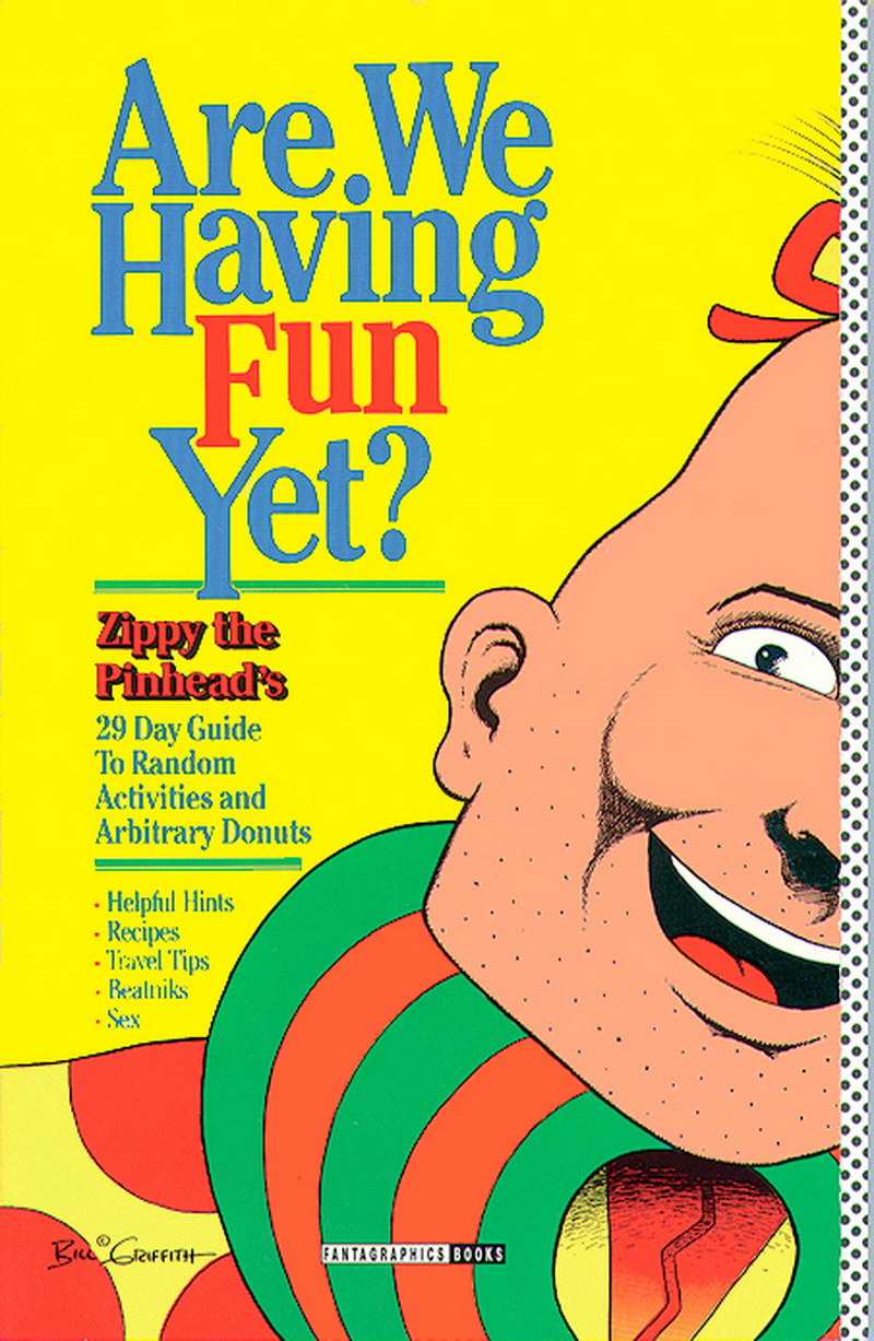 "Zippy the Pinhead's 29 Day Guide to Random Activities and Arbitrary Donuts" is not a collection of underground comix or syndicated strips, but an all-original trip on the Freeway of Fun featuring Zippy, Griffy, Half-Life, and the rest of gang. This highly-structured explosion of madness, satire and epic adventure takes all of Griffith's favorite pop culture themes — Ernie Bushmiller, junk food, commercial "cute," beatniks, cubism, modern Japan, Jean-Paul Sartre, Laundromats, '70s fashion, and Jack Palance — to their outer limits.