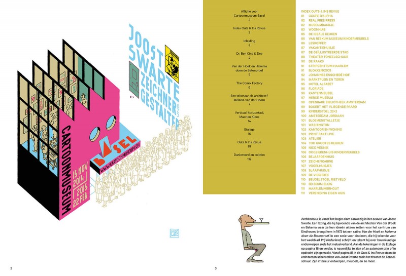 Joost Swarte beperkt zich niet tot één discipline: hij illustreert, werkt als grafisch vormgever, maakt boeken, tekent letters, ontwerpt postzegels en affiches. De architectuur verwierf gaandeweg een vaste plek in het werk van Swarte. Eerst in zijn tekeningen, later in echte gebouwen. Na het bundelen van zijn The New Yorker-illustraties in New York Boek en zijn boekgerelateerde en pictogramontwerpen in Biblio + Picto, verzamelt Out & Ins Swartes architectuurprojecten. Naast zijn grafisch werk waarin architectuur een prominente rol speelt, bevat Out & Ins ook zijn ontwerpen voor menig architectuurproject: van trapramen tot hele gebouwen. 64 pagina’s prachtig beeldmateriaal plus 56 pagina’s diepgaande documentatie: een boek dat niet te missen is voor de echte Swarte-liefhebber. Verschijnt ook als luxe met andere cover en gesigneerde prent, genummerd op 125 exemplaren.
