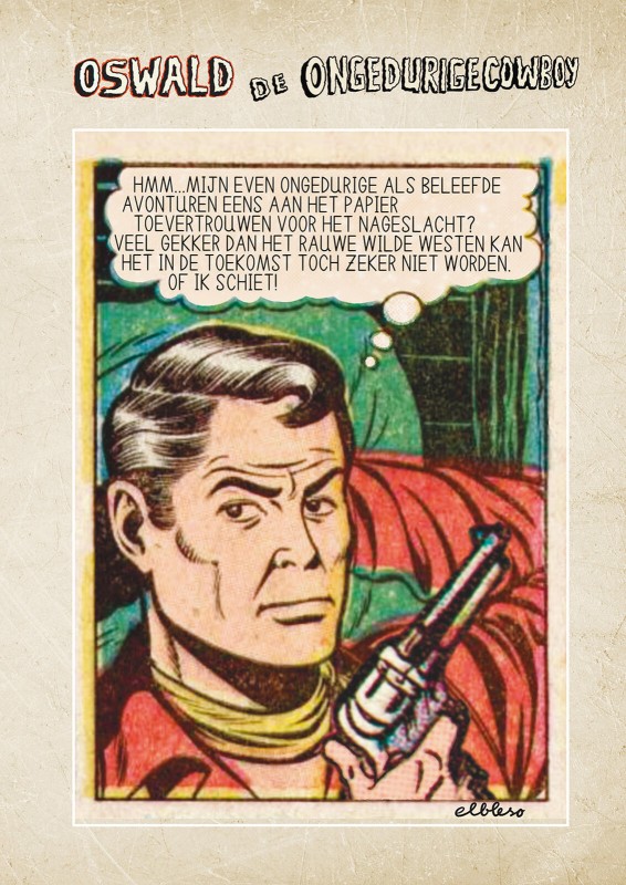 De western: het enige genre met een eeuwig schroeiende zon, schaduw - en dat al meer dan een eeuw lang! Hier draait alles om cowboys die met één kogel hun zaakjes regelen, outlaws die net op tijd de dans ontspringen, en saloons met een pianospeler die gewoon doorspeelt als er stoelen door het raam vliegen. De western is comfort food voor het brein: even vertrouwd als je oude lievelingstrui, met smakelijke ingrediënten die je meenemen naar een wereld zonder wifi, met een trouw paard en een onuitputtelijke voorraad patronen. Een genre dat zo heerlijk herkenbaar is, leent zich goed voor een verrassende draai. In deze absurde, hilarische bloemlezing uit het rijke œuvre van elbleso (in de traditie van Kamagurka, Gummbah en Jeroom) komen westernclichés op hun kop te staan, als er andere elementen insluipen door stil te staan bij onder andere hygiëne, nuance en taalgebruik. Natuurlijk zijn er dravende paarden, doortrapte schurken, hulpeloze jongedames en vooral: revolvers, revolvers, revolvers. Maar dan anders. En Oswald? Die heeft er een scherp oog voor — en nog minder geduld. Hij legt de vinger op elke gevoelige plek en trekt sneller dan zijn schaduw. Of hij schiet!