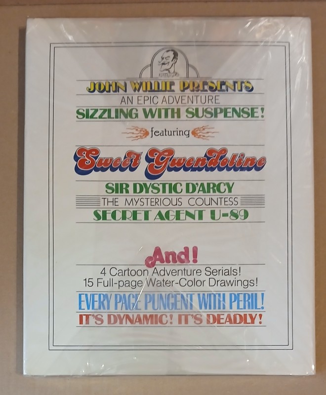 The Adventures of Sweet Gwendoline‹ is a BDSM-themed erotic comic strip created by American artist John Willie (John Alexander Scott Coutts). The comics, which were first published in the 1940s and 1950s, became iconic within the fetish subculture. The series follows the adventures of Sweet Gwendoline, a naïve and innocent young woman who frequently finds herself in compromising and perilous situations. Gwendoline is for the most part portrayed as a damsel in distress, captured or restrained by various antagonists, only to be rescued?or sometimes further entrapped?by other characters. The stories delve into themes of bondage, fetishism, and power dynamics, with Gwendoline’s innocence sharply contrasting against the more worldly and often sinister figures who surround her.